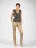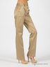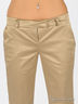 Прямые женские брюки из лоснящегося материала. Отрезной пояс со шлевками. Застегиваются на молнию, пуговицу и крючок. Четыре кармана.