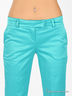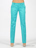 Прямые женские брюки из лоснящегося материала. Отрезной пояс со шлевками. Застегиваются на молнию, пуговицу и крючок. Четыре кармана.