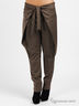 Эффектные брюки из тонкой, плотной саржевой ткани. Застежка на пуговицу и молнию. Спереди брюки декорированы запахами, закрепленными на пуговицы. Талия подчеркивается с помощью лент, завязывающихся спереди. Длинные зауженные брючины. Будьте всегда в центре внимания!
