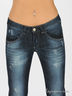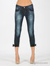 Укороченные брюки из денима. Отрезной пояс со шлевками. Застегиваются на молнию и пуговицу. Четыре кармана. Края карманов и кокетка сзади украшены тюлевыми вставками. Края брючин с манжетами. По внутреннему шву небольшая молния.