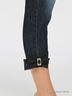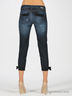 Укороченные брюки из денима. Отрезной пояс со шлевками. Застегиваются на молнию и пуговицу. Четыре кармана. Края карманов и кокетка сзади украшены тюлевыми вставками. Края брючин с манжетами. По внутреннему шву небольшая молния.