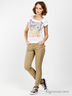 Детали: отрезной пояс со шлевками для ремня, застежка на пуговицу и молнию, два прорезных кармана спереди, два накладных сзади декорированы вышивкой, расклешенные брючины, модель декорирована металлическими клепками.