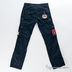 Модель прямого кроя застегивается на пуговицу и молнию. Два передних кармана, два задних кармана на кнопке, три боковых кармана на брючинах на кнопках. К поясу пришиты шлевки. Множество декоративных нашивок.