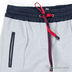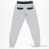 Детали: пояс на широкой резинке дополнен шнурком, четыре кармана, простроченные стрелки, низ изделия на трикотажной манжете в рубчик.