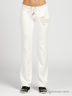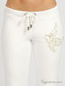 Спортивные трикотажные брюки, украшены кружевной аппликацией в виде голубя со стразами. В поясе - эластичная резинка. Завязки оформлены металлическими наконечниками.