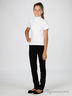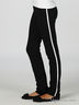 Спортивные трикотажные брюки прямого покроя с белыми лампасами. Верх изделия посажен на широкую резинку.