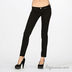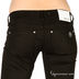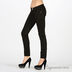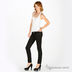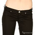 Зауженная модель застегивается на пуговицу и молнию. К поясу пришиты петли для ремня. Один передний карман, имитация двух стандартных передних карманов, два задних кармана. На правом заднем кармане декоративная вышивка металлизированной серебристой нитью.