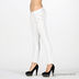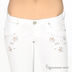 Слегка зауженные к низу женские брюки. Прямые женские джинсы. Отрезной пояс, есть шлевки дял ремня. Пять карманов. Сзади посажены на кокетку. Застегиваются на молнию и пуговицу. Украшены декоративной перфорацией, ожурной вышивкой и пайетками.