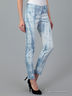 Интересные по дизайну зауженные брюки придутся по душе истинной моднице. Изделие с застежкой спереди, выполнено в красивой расцветке с рисунком. На талии предусмотрены шлевки для ремня.