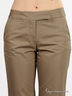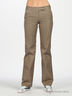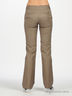 Слегка расклешенные брюки из лоснящегося материала. Отрезной пояс с небольшим треугольным вырезом сзади. Спереди два втачных кармана, один прорезной, сзади два прорезных. Брюки затериваются на молнию, пуговицу и крючок.
