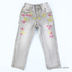 Джинсовые брюки с имитацией застежки на молнию. В пояс вшита резинка, пришиты шлевки. Карманы. Эффект потертости, аппликации.
