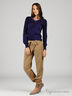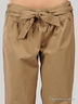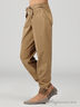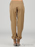 Стильные брюки широкого кроя, зауженного книзу из плотной хлопковой ткани. Застегиваются на молнию и на пуговицу на левом боку. Широкий пояс дополнен лентой, завязывающейся спереди. Низ брюк дополнен многорядной широкой резинкой.