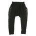 Объемная модель, низ брючин посажен на манжету. Боковые швы декорированы металлическими элементами.