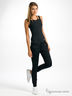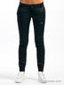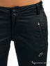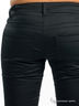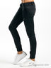 Брюки женские черного цвета. Заужены к низу. Выполнены их хлопчатобумажной ткани. Отрезной пояс, есть шлевки для ремня. Застежка на молнии и двух кнопках. Три кармана спереди, один из них на молнии. Два накладных кармана сзади. По нижнему краю брюк расположены манжеты на широкой резинке.