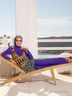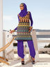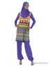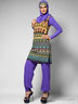 Внутренний купальник соответствует размеру 46В ( объем под грудью 75-80 см, чашка В)Молодежный купальный костюм – буркини, который состоит из боди, брюк, туники, шапочки и капора. Боди с длинными рукавами фиалкового цвета анатомического кроя. Брюки фиалкового цвета на эластичном поясе к низу зафиксированы манжетами. Туника без рукавов из принтованной ткани с разрезами по бокам. Костюм из быстросохнущей купальной ткани дополнен внутренней принтованной шапочкой, бони и фиалковым капором для комфортной носки на пляже и в бассейне для женщин исповедующих ислам.