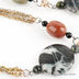 Прелестные бусы, уместные как на торжественных и официальных мероприятиях, так и на корпоративном вечере или на молодежной тусовке. Не имеют возрастных ограничений. Бусы состоят из трех фрагментов, в каждом из которых присутствуют обязательные элементы: "яшмовый", "кожаный", "лабрадоритовый", последовательно сочлененные "золотой" фурнитурой. Доминанта – яшмовые бусины различных форм и оттенков. Большая длина и множество вариантов ее фиксации позволяют носить эти бусы различными способами. Рекомендации автора: в две нити, чтобы была видна вся яшма, или в виде классического лариата.