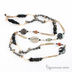 Прелестные бусы, уместные как на торжественных и официальных мероприятиях, так и на корпоративном вечере или на молодежной тусовке. Не имеют возрастных ограничений. Бусы состоят из трех фрагментов, в каждом из которых присутствуют обязательные элементы: "яшмовый", "кожаный", "лабрадоритовый", последовательно сочлененные "золотой" фурнитурой. Доминанта – яшмовые бусины различных форм и оттенков. Большая длина и множество вариантов ее фиксации позволяют носить эти бусы различными способами. Рекомендации автора: в две нити, чтобы была видна вся яшма, или в виде классического лариата.