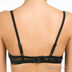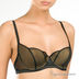 Бюстгальтер на косточках . Двойной вертикальный шов на чашечках. Диагональные швы на чашечках. Бретели регулируются по длине, не снимаются. Застежка на два крючка, петли расположены в два ряда. Выполнен из сочетания сетчатого и атласного материала черного цвета, чашечки золотистые. Хлопковая подкладка.