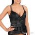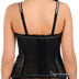 Поролоновые чашки. Изделие усилено косточками. Застежка на четырнадцать крючков в три позиции. Изделие декорировано вышивкой, пуговками и сетчатой оборкой по верхней части. Бретели украшены тесьмой.