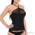 Поролоновые чашки. Изделие усилено косточками. Застежка на пятнадцать крючков в три позиции. Верхняя часть над лифом - сетка. Бретели регулируются, а также скрещиваются на спинке при помощи специальной застежки