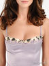 Оригинальное бюстье из тонкой слегка эластичной шелковистой ткани, спинка из тонкого эластичного сетчатого материала. Чашки на косточках с поролоновым уплотнителем, съемные эластичные бретели регулируются по длине, внутренняя застежка на два крючка в три позиции. Декорировано вставкой с принтом и кружевом.