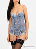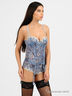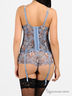 Оригинальное бюстье выполнено из тонкой двухслойной сетчатой ткани с рисунком. Поролоновые чашки на косточках, съемные эластичные бретели регулируются по длине. Застегивается на крючки в три позиции. Дополнено съемными пажами для чулок. Декорировано вышивкой.