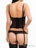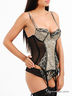 Великолепное бюстье из тонкого трикотажа на подкладе и тонкой сетчатой ткани. Формованные поролоновые чашки на косточках дополнены съемным уплотнителем, создающим эффект push up и хлопковой подкладкой. Съемные бретели регулируются по длине, застежка на крючки в три позиции. Бюстье декорировано кружевными вставками и оригинальным рисунком, дополнено съемными пажами для чулок и вертикальными косточками для поддержания формы.