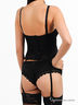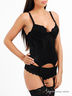 Великолепное бюстье из тонкой сетчатой ткани с жаккардовым плетением на подкладке. Формованные поролоновые чашки на косточках дополнены съемным уплотнителем, создающим эффект push up и хлопковой подкладкой. Съемные бретели регулируются по длине, застежка на крючки в три позиции. Бюстье декорировано кружевными вставками, дополнено съемными пажами для чулок и вертикальными косточками для поддержания формы.
