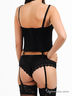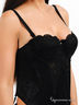 Очаровательное бюстье из тонкой сетчатой ткани с жаккардовым плетением на подкладке. Формованные поролоновые чашки на косточках дополнены съемным уплотнителем, создающим эффект push up и хлопковой подкладкой. Съемные бретели регулируются по длине, застежка на крючки в три позиции. Верхняя часть внутри усилена силиконовыми лентами, вертикальные косточки. Бюстье декорировано кружевными вставками, дополнено съемными пажами для чулок.