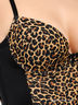 Великолепное бюстье из тонкой эластичной ткани. Формованные чашки на косточках с тонким поролоном и съемным уплотнителем push-up имеют хлопковую подкладку. Несъемные эластичные бретели регулируются по длине, застежка на крючки в две позиции. Нижняя часть изделия усилена вертикальными косточками. Передняя часть декорирована принтом - леопард. Бюстье дополнено съемными пажами для чулок.