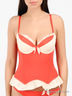 Отличное бюстье из тонкой эластичной ткани. Формованные чашки на косточках с тонким поролоном и съемным уплотнителем push-up имеют хлопковую подкладку. Несъемные эластичные бретели регулируются по длине, застежка на крючки в две позиции. Нижняя часть изделия усилена вертикальными косточками. Чашки и декоративные оборки контрастного цвета с рисунком.
