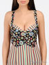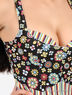 Отличное бюстье оригинального кроя из тонкой эластичной ткани с ярким рисунком. Формованные чашки на косточках с тонким поролоном, дополнены съемными вкладками с эффектом push-up. Спинка усилена резинками внутри, эластичные бретели не регулируются.