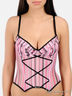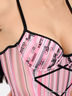Великолепное бюстье из тонкой сетчатой ткани с рисунком - полоска. Формованные чашки на косточках с тонким поролоном и съемным уплотнителем push-up имеют хлопковую подкладку. Несъемные эластичные бретели регулируются по длине, застежка на крючки в две позиции. Нижняя часть изделия усилена вертикальными косточками. Бюстье декорировано вышивкой на чашках и контрастной шнуровкой на передней части.