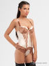 Великолепное бюстье из тонкой эластичной атласной ткани. Формованные чашки с тонким поролоном на косточках, дополнены съемным уплотнителем, создающим эффект push-up. Чашки с хлопковой подкладкой, несъемные бретели регулируются по длине, застежка на крючки в две позиции. Бюстье усилено вертикальными косточками, дополнено съемными пажами для чулок. Декорировано контрастными кружевными нашивками.