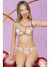 Бюстгальтер с формованной чашкой выполнен из принтованной микрофибры с растительным рисунком. По верхнему краю чашек настрочена тонкая тесьма, но нижнему краю проходит декоративная тесьма с мелкой складкой. Чашки поддерживаются металлическими каркасами. Спереди по центру узкой детали маленький металлический цветочек со стразом. Верхняя часть бретели из основного полотна. Подкладка чашек из хлопка.
