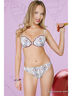 Бюстгальтер с формованной чашкой выполнен из принтованной микрофибры с растительным рисунком. По верхнему краю чашек настрочена тонкая тесьма, но нижнему краю проходит декоративная тесьма с мелкой складкой. Чашки поддерживаются металлическими каркасами. Спереди по центру узкой детали маленький металлический цветочек со стразом. Верхняя часть бретели из основного полотна. Подкладка чашек из хлопка.