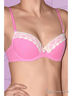 Бюстгальтер с поролоновой чашкой на каркасе выполнен из эластичного хлопкового полотна. Для придания дополнительного объёма груди имеются съёмные вкладыши. Чашка с диагональным рельефом. Верхняя часть чашки украшены кружевом. По центру бюстгальтера маленький бантик. Задняя деталь выполнена из эластичного хлопкового полотна, застежка на крючках в один ряд. Бретели съёмные. Подкладка чашек из хлопка.