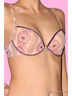 Бюстгальтер с формованной чашкой выполнен из принтованной микрофибры с растительным рисунком. По верхнему краю чашек настрочена тонкая тесьма, но нижнему краю проходит декоративная тесьма с мелкой складкой. Чашки поддерживаются металлическими каркасами. Спереди по центру узкой детали маленький металлический цветочек со стразом. Верхняя часть бретели из основного полотна. Подкладка чашек из хлопка.