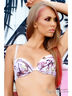 Бюстгальтер с поролоновой чашкой выполнен из принтованной микрофибры с абстрактным рисунком. Чашки с горизонтальным рельефом имеют с внутренней стороны карманы для съемных вкладышей для придания эффекта пуш-ап. Чашки поддерживаются металлическими каркасами. Бретели съемные в цвет основного полотна. Подкладка чашек из хлопка. Задние детали бюстгальтера выполнены из принтованной эластичной микрофибры, застежка на крючки в один ряд.