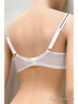 Бюстгальтер с мягкой чашкой выполнен из тонкого жаккардового полотна с рисунком в полоску. Чашки с горизонтальным рельефом, верхняя часть чашки выполнена из вышивки на сетке. Чашка имеет боковой подрез, переходящий в бретель. Верхний ажурный край чашки сдерживается тонкой силиконовой тесемкой с изнаночной стороны. Центральная часть стана выполнена из вышивки на сетке. По центру передней детали украшение в виде маленького атласного бантика. Боковая и нижняя части чашки на хлопковой подкладке. Чашки поддерживаются металлическими каркасами. По боковой части бюстгальтера стоит усилитель с костью. Сзади закругленный вырез.