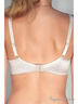 Бюстгальтер с мягкой чашкой выполнен из сатина. Чашка с Т-образным рельефом. Нижняя часть чашки из сатина, верхняя часть чашки выполнена из сатина с вышивкой. Верхний ажурный край вышивки закреплен тонкой резинкой с изнаночной стороны. Чашки поддерживаются металлическими каркасами. По центру широкой передней детали украшение маленький атласный бантик. Бретели в цвет основного полотна. Бретели украшены маленьким атласным бантиком. Подкладка чашек из хлопка. Боковые детали с поддерживающими костями. Сзади закругленный вырез.
