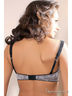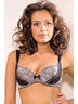 Бюстгальтер с формованной чашкой выполнен из тонкого жаккардового полотна с растительным рисунком. По боковому и нижнему краю чашки отделка из кружева. Чашки поддерживаются металлическими каркасами. Внутри чашки имеются небольшие поролоновые валики для создания легкого эффекта пуш-ап. Спереди по центру украшение в виде атласного бантика. Ажурные съемные бретели. По боковой части бюстгальтера поддерживающие кости. Подкладка чашек из хлопка. Для бюстгальтеров с маленькими размерами чашек застежка на крючок и три петли в один ряд. Для больших размеров застежка более широкая с крючками и петлями, расположенными в два ряда.