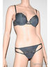 Бюстгальтер с формованной чашкой и встроенными вкладышами на каркасах выполнен из гладкой микрофибры. Чашка с вертикальным рельефом и вышивкой на микрофибре вдоль верхнего края. Передняя деталь выполнена двух параллельных узких тесемок, украшенных по центру маленьким атласным бантиком. Боковые детали с поддерживающими косточками. Передняя часть боковой детали выполнена из вышивки на микрофибре. Съёмные регулирующиеся бретели. Подкладка чашек выполнена из хлопка.