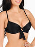 Бюстгальтер с плотной чашкой, на косточках. Несъемные бретели регулируются по длине. Металлическое кольцо с бантиком между чашечками. Застежка на металлический крючок.