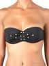 Бюстгальтер в форме бандо на силиконе с корсетными костями на боковых панелях. Декоративные элементы расположены ромбом посередине передней панели. Съемные бретели завязываются на шее.