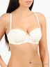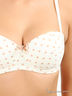 Оригинальный бюстгальтер балконет с поролоновыми чашками на косточках. Выполнен из шелковистой эластичной ткани с рисунком - горох. Регулируемые съемные эластичные бретели-трансформеры, с возможностью застежки вокруг шеи. Спинка усилена силиконовой лентой. Застегивается на два крючка в три позиции.