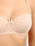 Оригинальный бюстгальтер балконет с поролоновыми чашками на косточках. Выполнен из шелковистой эластичной ткани с рисунком - горох. Регулируемые съемные эластичные бретели-трансформеры, с возможностью застежки вокруг шеи. Спинка усилена силиконовой лентой. Застегивается на два крючка в три позиции.