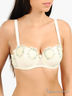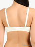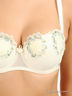Оригинальный бюстгальтер балконет с поролоновыми чашками на косточках. Выполнен из тонкой гладкой эластичной ткани, чашки из сетчатой ткани. Регулируемые съемные эластичные бретели-трансформеры, с возможностью застежки вокруг шеи. Застегивается на два крючка в три позиции. Спинка усилена силиконовой лентой. Декорирован оригинальными нашивками.