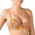 Яркий бюстгальтер балконет Push-up преимущественно оранжевого оттенка декорирован спереди и на лямках изящными бантиками с жемчужиной. Боковые и задние детали украшены широкой тесьмой-вышивкой.