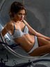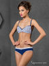 Бюстгальтер выполнен в белом цвете с синим раппортным принтом в виде сложного узора. Тонкая резинка с фестонным краем, которой обработаны все детали изделия, обеспечивает непревзойдённый комфорт. Изящные бантики из шелкового шнура делают модель стильной и элегантной.